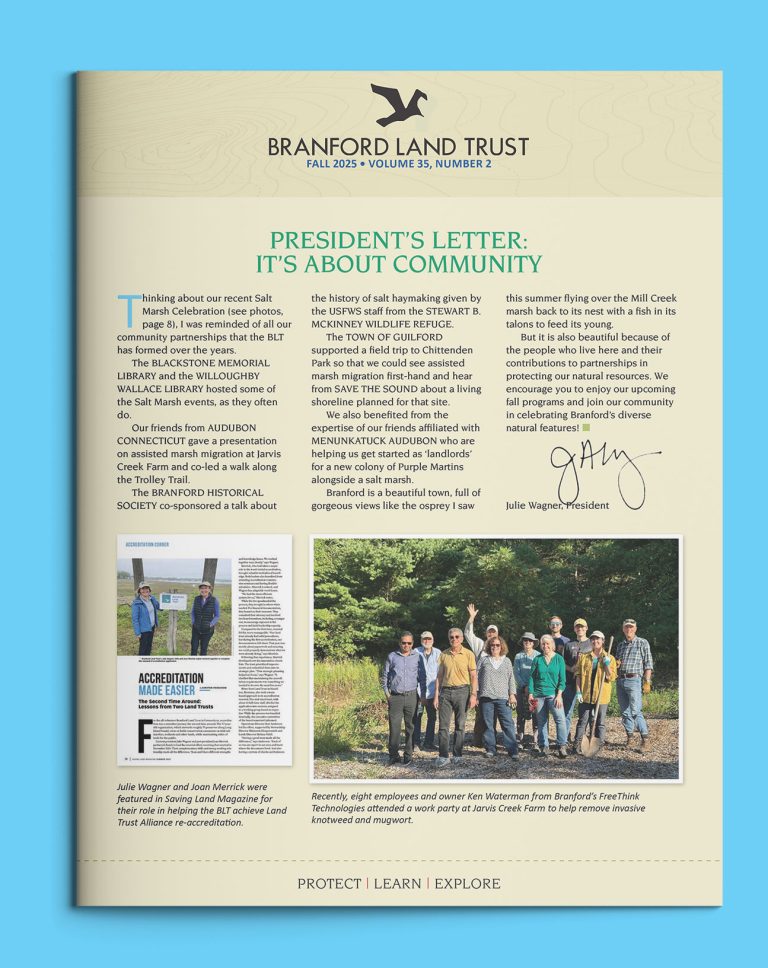 The Branford Land Trust newsletter is printed at least twice a year and distributed to members.