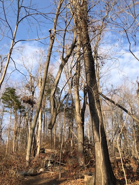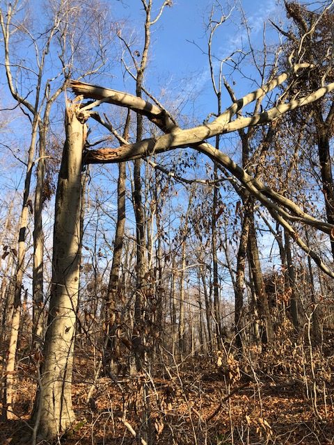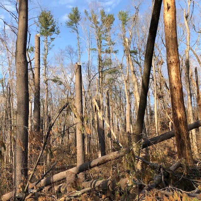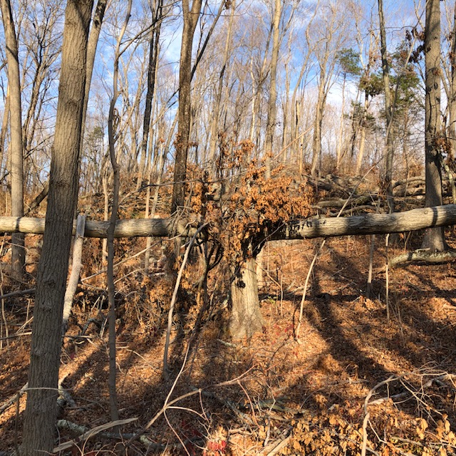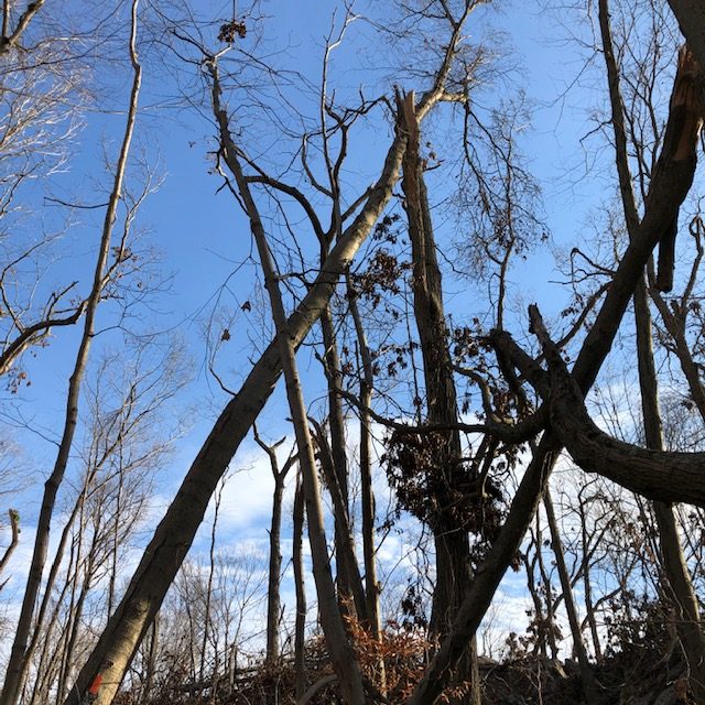 I parked, walked onto the Red Trail, and was appalled by the extent of the damage. Oaks snapped. Oaks felled. Limbs splintered and hanging high above, widowmakers waiting to descend. Five minutes in, I heard a rustling falling, and a terminal thud. A storm-ripped piece had hit the ground 20 feet away. I warned a family, masked and out for a stroll. “Keep your eyes up, it’s not safe here.”