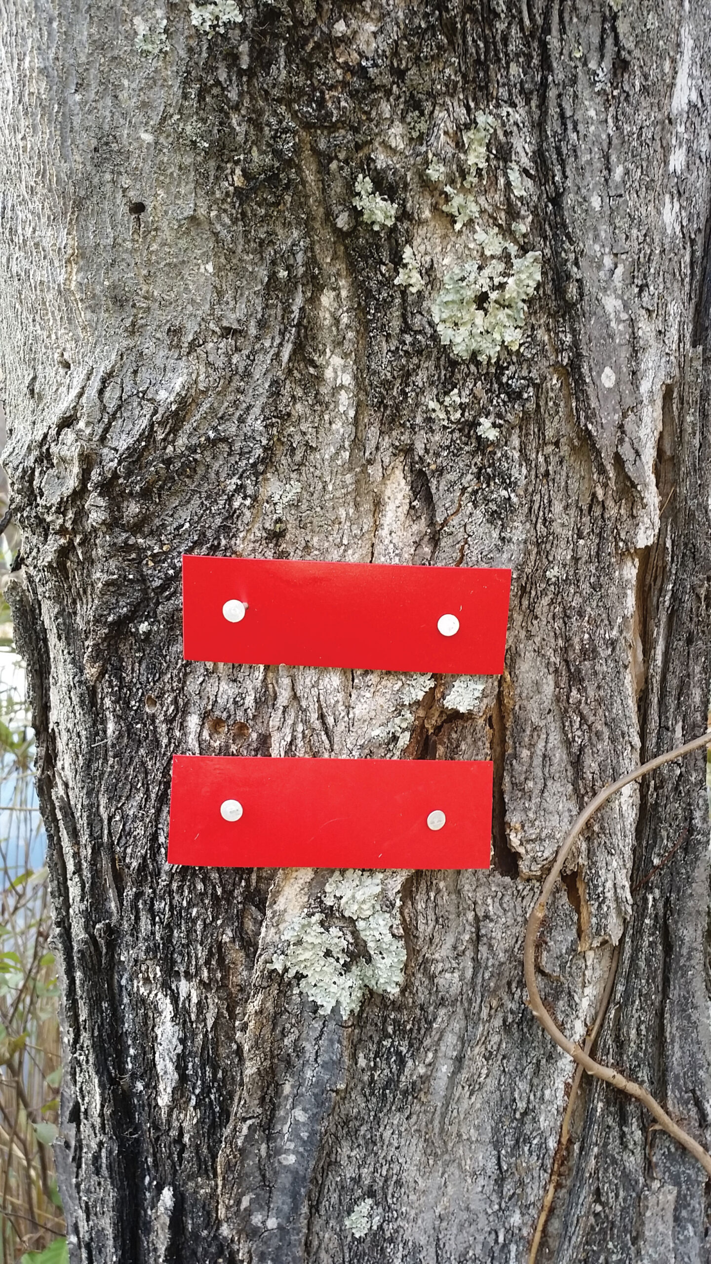 Two vertical blazes with one off-set above the other, indicates that there is a turn ahead. The higher marker lets you know which direction — left or right.