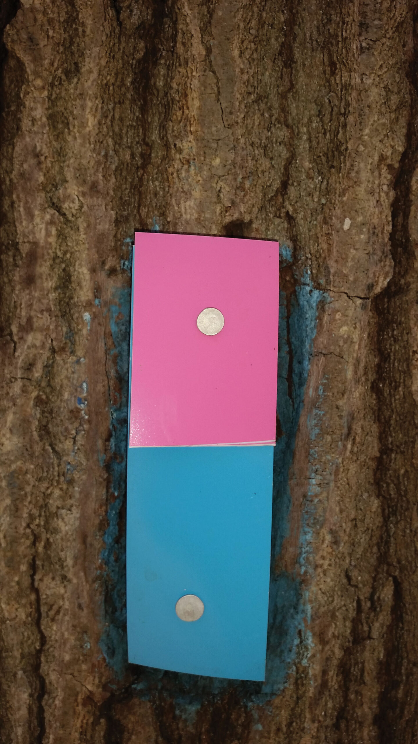 One vertical blaze with two colors, marks a connector trail. The color on top is the trail ahead, the lower half is the trail you came from.